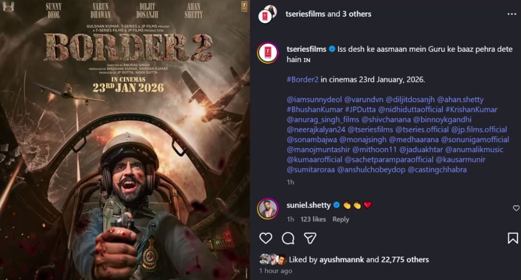 अनुराग सिंह के डायरेक्शन में बनी ‘बॉर्डर 2’ जे.पी. दत्ता की 1997 की ‘बॉर्डर’ का सीक्वल है, जो 1971 के भारत-पाकिस्तान युद्ध के बैकग्राउंड पर बनी है। सीक्वल में सनी देओल, वरुण धवन, दिलजीत दोसांझ, अहान शेट्टी, मेधा राणा, मोना सिंह और सोनम बाजवा लीड रोल में हैं।भूषण कुमार, जे.पी. दत्ता और निधि दत्ता द्वारा प्रोड्यूस की गई ‘बॉर्डर 2’ को टी-सीरीज ने जे.पी. फिल्म्स के साथ मिलकर पेश किया है। ‘बॉर्डर 2’ 23 जनवरी, 2026 को रिपब्लिक डे वीकेंड पर थिएटर में रिलीज होगी। Bollywood: