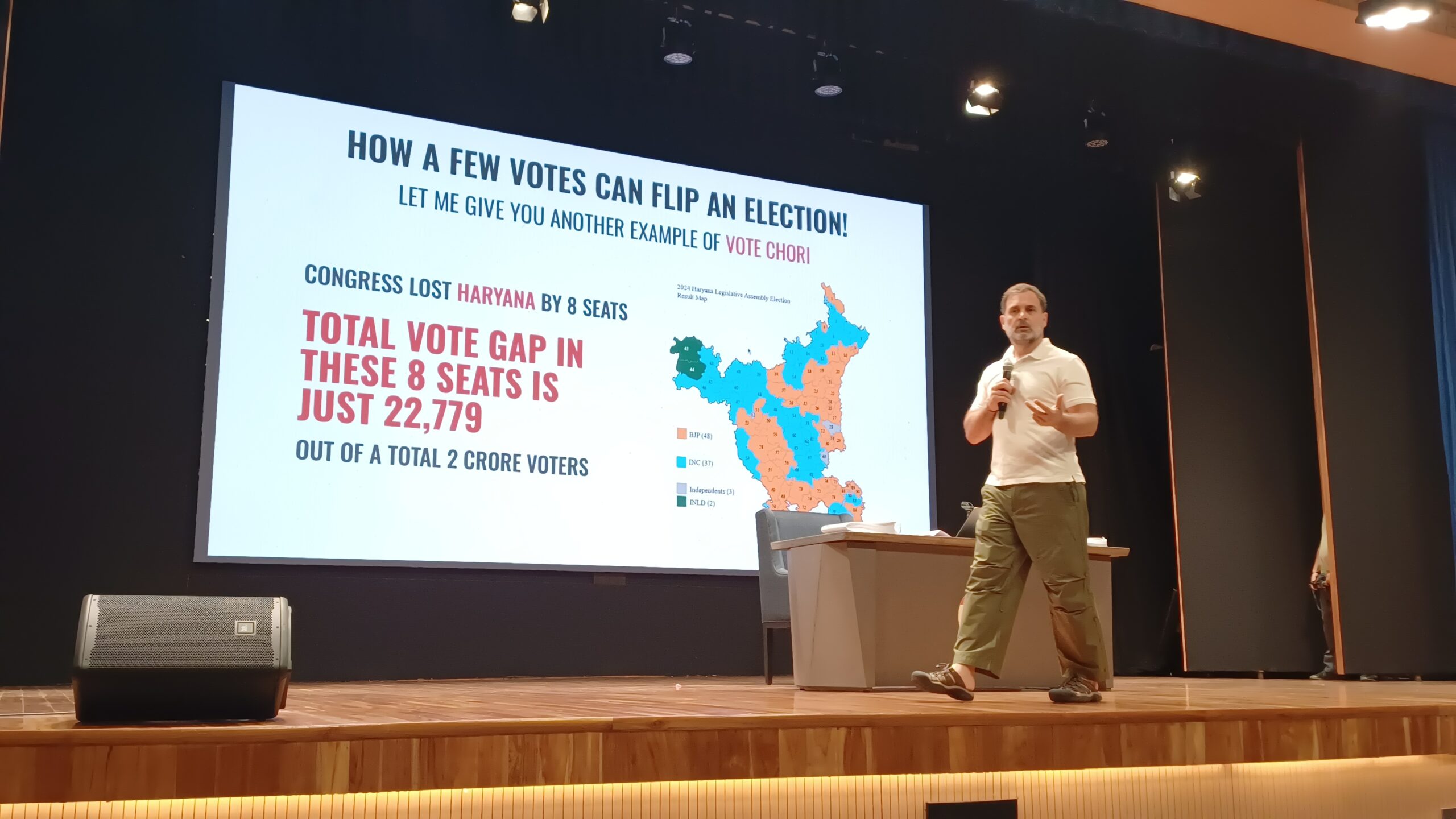 राहुल गांधी के प्रेजेंटेशन की स्लाइड्स,के जरिये वोटर लिस्ट की गड़बड़ियां दिखाई है।राहुल गांधी ने यह भी आरोप लगाया कि एक ही पते पर 46 से 80 वोटर दर्ज हैं, और कई जगह मकान नंबर ‘0’ पर हजारों वोटरों के नाम हैं। राहुल गांधी ने कर्नाटक के महादेवपुरा विधानसभा क्षेत्र का उदाहरण देते हुए कहा कि इस सीट पर बीजेपी ने 1 लाख से अधिक वोटों के अंतर से जीत हासिल की, लेकिन उनकी जांच में पाया गया कि 1 लाख से अधिक वोटर या तो डुप्लीकेट हैं या उनके पते गलत हैं।Rahul Gandhi: