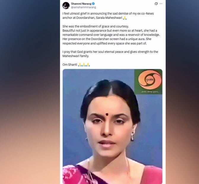 नारंग ने कहा, ‘‘दूरदर्शन में मेरी पूर्व सह-समाचार प्रस्तोता सरला माहेश्वरी के निधन की जानकारी देते हुए मुझे अत्यंत पीड़ा हो रही है।’’ उन्होंने माहेश्वरी को ‘‘शिष्टता और विनम्रता की साक्षात प्रतिमूर्ति’’ के रूप में याद किया। नारंग ने सोशल मीडिया मंच पर पोस्ट किया, ‘‘मुझे यह बताते हुए बहुत दुख हो रहा है कि दूरदर्शन में मेरी पूर्व सह-समाचार प्रस्तोता सरला माहेश्वरी का निधन हो गया है… वह न केवल दिखने में सुंदर थीं बल्कि हृदय से भी कहीं अधिक उदार थीं, भाषा पर उनकी अद्भुत पकड़ थी और वह ज्ञान का भंडार थीं।’ Sarla Maheshwari: