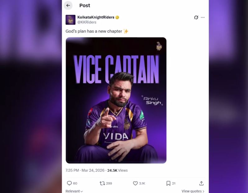 Sports News: तीन बार की चैंपियन कोलकाता नाइट राइडर्स (केकेआर) ने मंगलवार को आईपीएल 2026 के लिए विस्फोटक बल्लेबाज रिंकू सिंह को टीम का उपकप्तान नियुक्त किया। यह फैसला फ्रेंचाइजी की दीर्घकालिक नेतृत्व रणनीति की ओर संकेत करता है।रिंकू सिंह कप्तान अजिंक्य रहाणे के साथ टीम की जिम्मेदारियां निभाएंगे, जिन्हें आईपीएल 2025 के निराशाजनक प्रदर्शन के बावजूद कप्तान बनाए रखा गया है।केकेआर के मुख्य कार्यकारी अधिकारी (सीईओ) वेंकी मैसूर ने टीम के ‘नाइट्स अनप्लग्ड 3.0’ कार्यक्रम के दौरान इसकी घोषणा करते हुए कहा, “रिंकू कप्तान के साथ करीबी तालमेल में काम करेंगे।”Sports News: